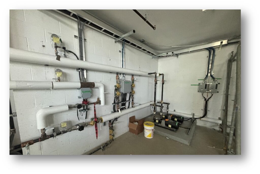 - Installation and commissioning of three gas boilers, three boiler loop pumps, and three district energy system (DES) loop pumps.